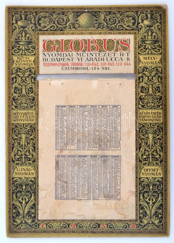 1938 A Globus Nyomdai Műintézet Rt. asztali naptárához tartozó papírál... https://www.darabanth.com/hu/282-Gyorsarveres/282.0/Festmeny-mutargy-papirregiseg-egyeb/Nyomtatvanyok~10/1938-A-Globus-Nyomdai-Muintezet-Rt-asztali-naptarahoz-tartozo-papirallvany-34x24-cm~II1458148