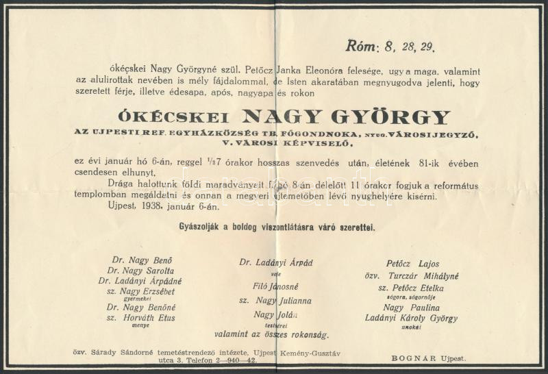 Leírás: 1938 ókécskei Nagy György (1857-1938) református főgondnok, újpesti városi jegyző, képviselő gyászjelentése