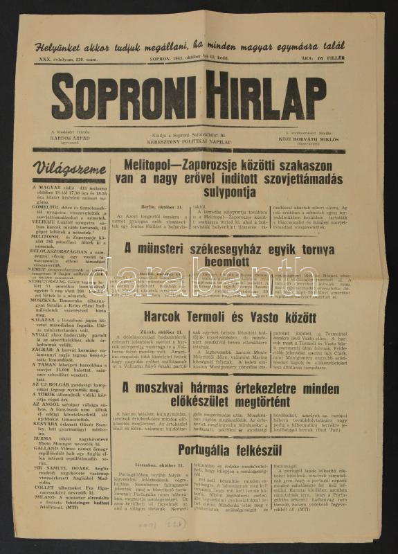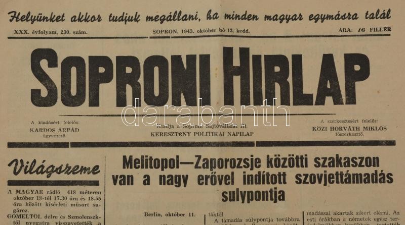 1943 A Soproni Hírlap - keresztény politikai napilap XXX. évfolyamának... https://www.darabanth.com/hu/282-Gyorsarveres/282.0/Festmeny-mutargy-papirregiseg-egyeb/Nyomtatvanyok~10/1943-A-Soproni-Hirlap--kereszteny-politikai-napilap-XXX-evfolyamanak-230-szama~II1457640
