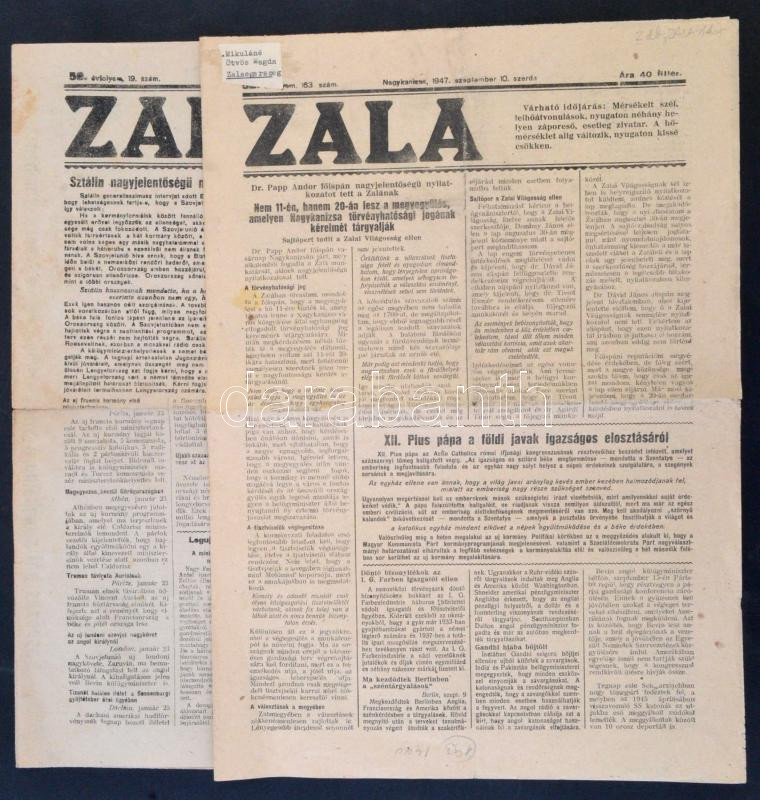 1947 Nagykanizsa, A Zala című újság 52. évfolyamának 19. és 163. száma... https://www.darabanth.com/hu/282-Gyorsarveres/282.0/Festmeny-mutargy-papirregiseg-egyeb/Nyomtatvanyok~10/1947-Nagykanizsa-A-Zala-cimu-ujsag-52-evfolyamanak-19-es-163-szama-egyikben-Kanizsa-to~II1457818
