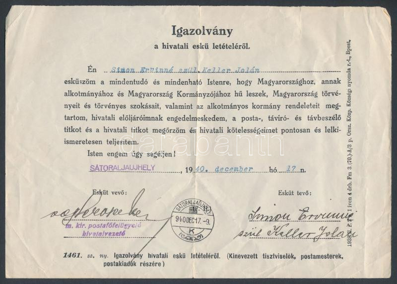 Leírás: Igazolvány a hivatali eskü letételéről Simon Ervinné szül Keller Jolán részére 1940-ből. Pecséttel, aláírásokkal.