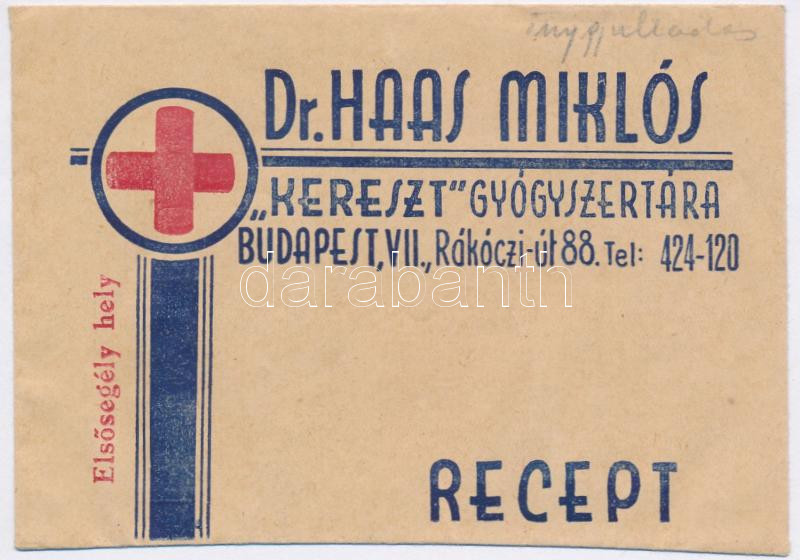cca 1920-1930 Dr. Haas Miklós "Kereszt" Gyógyszertárának(Bp.... https://www.darabanth.com/hu/282-Gyorsarveres/282.0/Festmeny-mutargy-papirregiseg-egyeb/Nyomtatvanyok~10/cca-1920-1930-Dr-Haas-Miklos-Kereszt-GyogyszertaranakBpVII-receptboritekja~II1399554