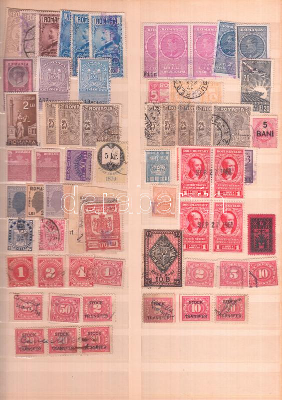 Leírás: 66 db román és USA okmány, illeték, biztosítás bélyeg berakólapon