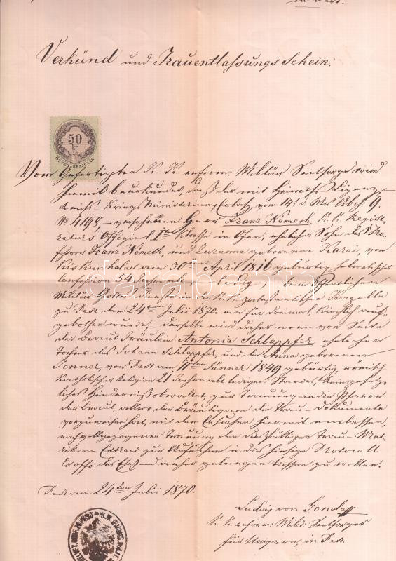 Leírás: 1870 50kr okmánybélyeg okiraton