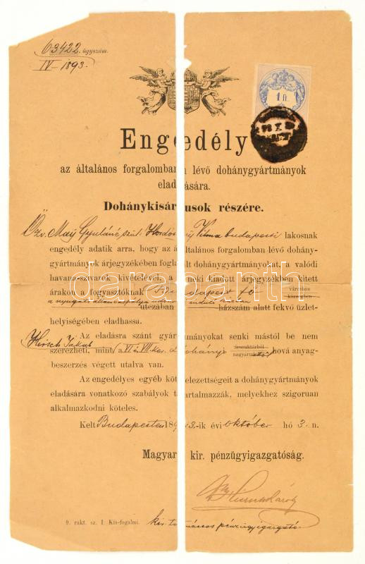 Leírás: 1893 Dohányárusítási engedély a budapesti Nyugati pályaudvar területén lévő üzletnek. Hajtásoknál szakadt