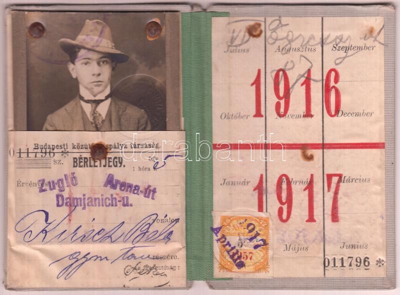 1916-1917 Tanuló bérletjegy, Budapesti Közúti Vaspálya Társaság, egy b... https://www.darabanth.com/hu/282-Gyorsarveres/282.0/Festmeny-mutargy-papirregiseg-egyeb/Okmanyok~25/1916-1917-Tanulo-berletjegy-Budapesti-Kozuti-Vaspalya-Tarsasag-egy-belyeggel-fotoval-ki~II1459612