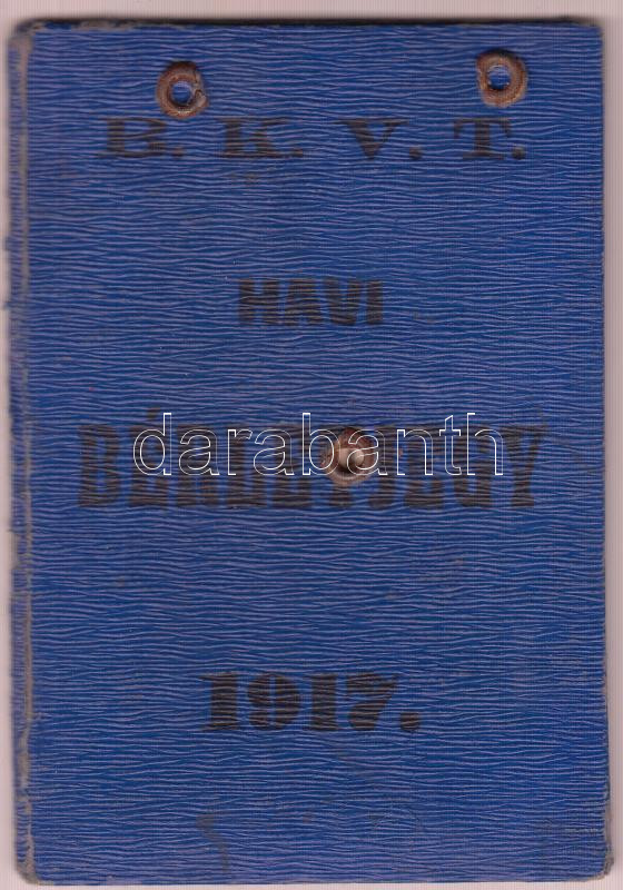 Leírás: 1917 Havi bérletjegy, Budapesti Közúti Vaspálya Társaság, egy bélyeggel, fotóval, kissé viseltes vászon kötésben.