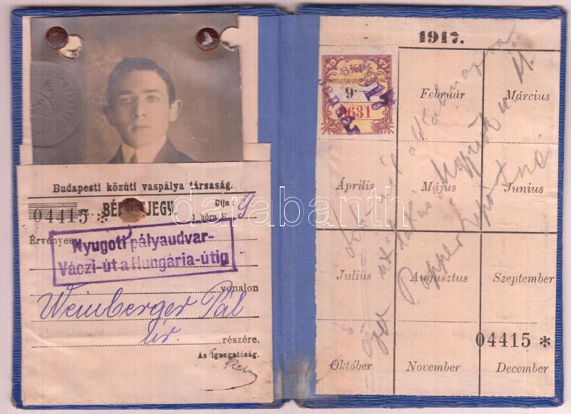 1917 Havi bérletjegy, Budapesti Közúti Vaspálya Társaság, egy bélyegge... https://www.darabanth.com/hu/282-Gyorsarveres/282.0/Festmeny-mutargy-papirregiseg-egyeb/Okmanyok~25/1917-Havi-berletjegy-Budapesti-Kozuti-Vaspalya-Tarsasag-egy-belyeggel-fotoval-kisse-vis~II1459614