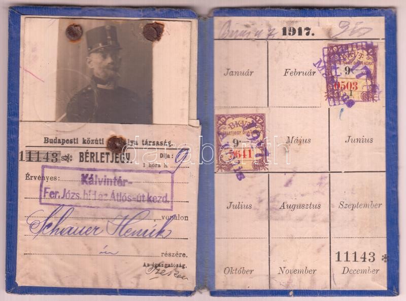 1917 Havi bérletjegy, Budapesti Közúti Vaspálya Társaság, két bélyegge... https://www.darabanth.com/hu/282-Gyorsarveres/282.0/Festmeny-mutargy-papirregiseg-egyeb/Okmanyok~25/1917-Havi-berletjegy-Budapesti-Kozuti-Vaspalya-Tarsasag-ket-belyeggel-fotoval-kisse-vi~II1459613