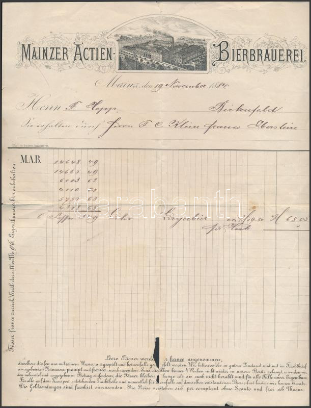 Leírás: 1884 Mainz Sörfőzde dekoratív számla