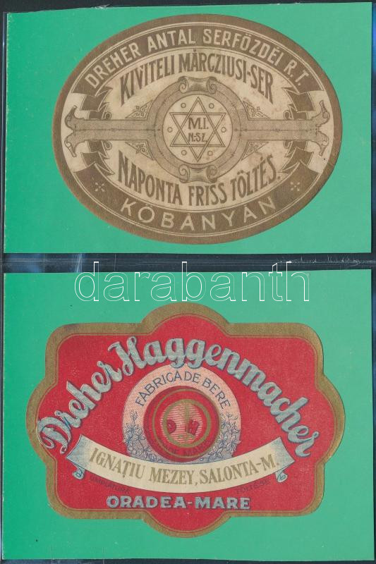 Leírás: cca 1910 2 db sörcímke: Dreher Haggenmacher Nagyvárad, Mezey Ignác töltése, Nagyszalonta; Dreher Antal serfőzdéi Rt. Kőbánya, kiviteli márciusi sör / 2 old Hungarian beer labels
