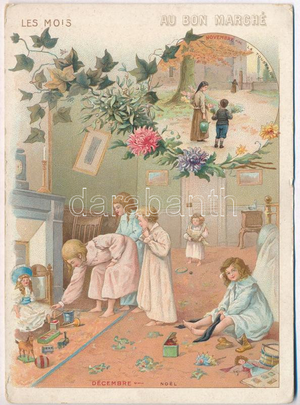 Leírás: cca 1910 Au Bon Marché, francia litho reklám kártya kétoldalas grafikával, 15×11 cm