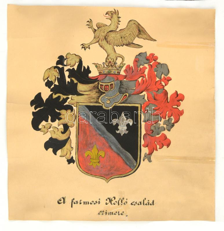 Leírás: cca 1900-1940 Farmosi Holló család címere, papír, vegyes technika, ragasztás nyomokkal, 40x39 cm.