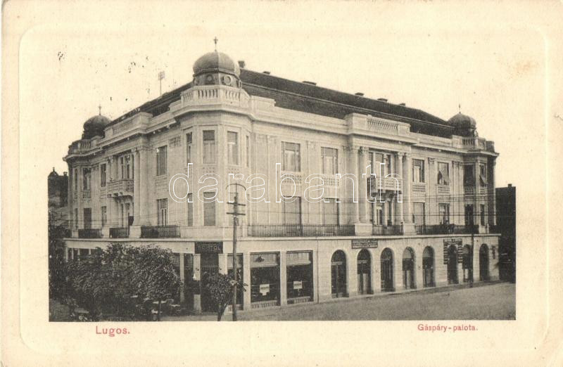 Lugos, Lugoj; Gáspáry palota, kiadja Nemes Kálmán / palace https://www.darabanth.com/hu/282-Gyorsarveres/282.0/Kepeslapok/Erdely~200008/Lugos-Lugoj-Gaspary-palota-kiadja-Nemes-Kalman-palace~II1457973