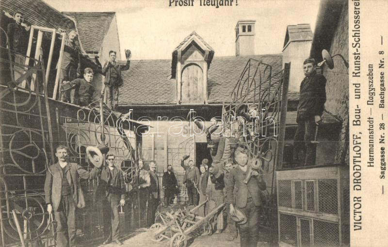 Nagyszeben, Hermannstadt, Sibiu; Victor Drodtloff lakatosüzeme, munkások. Újévi üdvözlet / Bau- und Kunst.Schlosseret; Saggasse Nr. 28., Bachgasse Nr. 8. / locksmith workshop, workers. New Year greeting