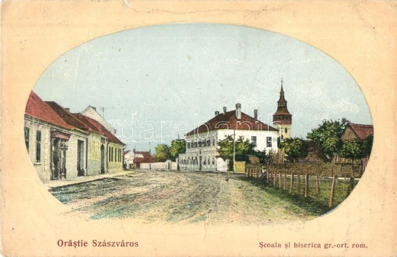 Leírás: Szászváros, Orastie, Broos; Görög katolikus templom és iskola / Greek Orthodox church and school (kis szakadás / small tear)