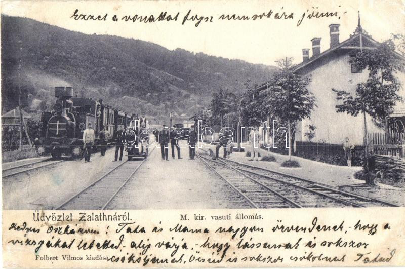 Leírás: Zalatna, Zlatna; Vasútállomás, vonat, hajtány, kiadja Folbert Vilmos / railway station, handcar (vágott / cut)