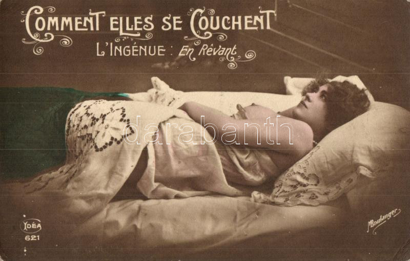 Leírás: 'Comment elles se couchent, L'ingenue: En Révant' erotic postcard with lady in bed, Idéa 621 s: Boulanger (EK)
