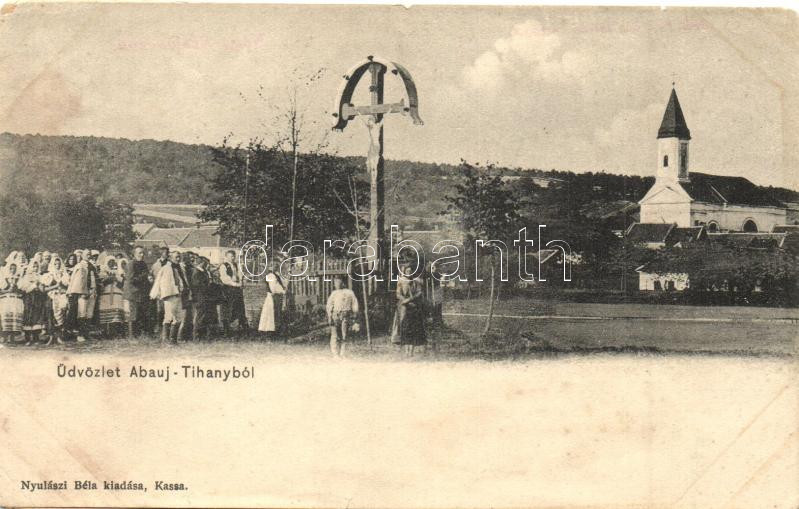 Hernádtihany, Abaúj-Tihany, Tahanovce; népviseletes csoportkép a Kálvária előtt, kiadja Nyulászi Béla / folklore group picture in front of the calvary (r)