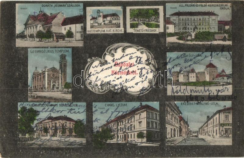 Leírás: Késmárk, Kezmarok; Donáth szálloda, temető, állami szövőipari szakiskola, Thököly vár, Freyer vendéglője / hotel, cemetery, schools, castle, restaurant, Art Nouveau