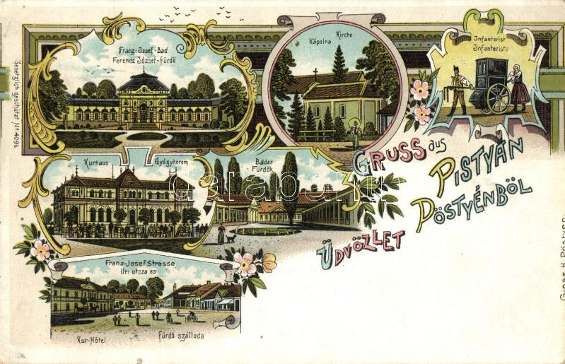 Leírás: Pöstyén, Piestany; Ferenc József fürdő és utca, Kápolna, Gyógyterem, fürdők, Infanterista / spas, chapel, Art Nouveau litho