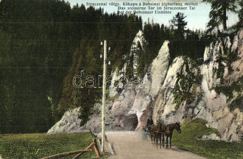 Leírás: Sztracena, Stratena; Dobsinai jégbarlang, völgy, lovaskocsi, "K.u.K. Militärzensur" pecséttel a hátoldalon, kiadja Divald és Monostory / ice cave, valley, horse cart, "K.u.K. Militärzensur" stamp on the backside