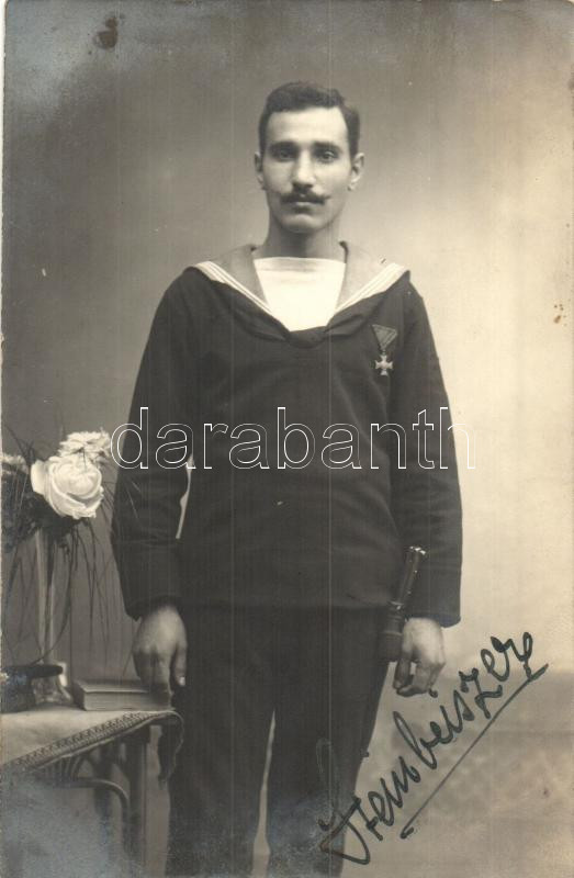 Leírás: 1914-1915 Osztrák-magyar tengerész, Mozgósítási Kereszt 1912-1913-as Emlékkereszt kitüntetéssel / Austro-Hungarian Navy mariner with Mobilization Cross 1912-1913" decoration, photo
