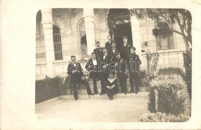 Leírás: Osztrák-magyar tengerésztisztek, az SMS Erzherzog Karl csatahajó matróza / Austro-Hungarian Navy officers, mariner of SMS Erzherzog Karl, photo (EB)