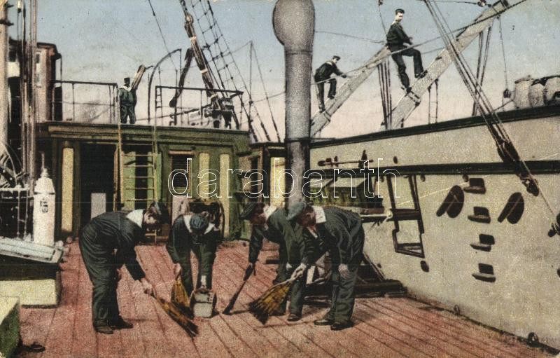 Leírás: Pola, Hajófedélzet takarítása / Spazzatura della coperta / Deckfegen / Kriegsmarine, cleaning on board (EK)