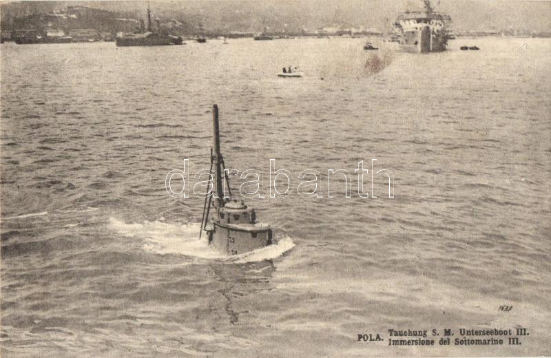 Pola, Tauchung SM Unterseeboot III / Immersion of the K.u.K. SM submar... https://www.darabanth.com/hu/282-Gyorsarveres/282.0/Kepeslapok/Hadihajo~200099/Pola-Tauchung-SM-Unterseeboot-III-Immersion-of-the-KuK-SM-submarine-III~II1456776