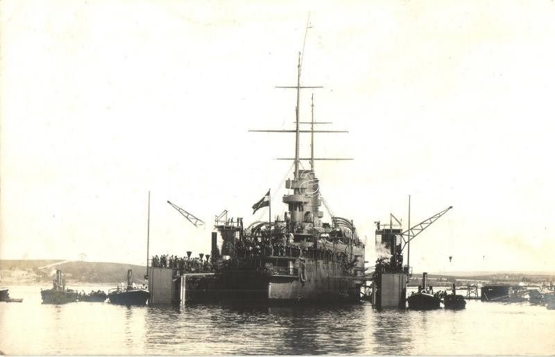 SMS Habsburg im Schwimmdock / SMS Habsburg, a K. u. K. haditengerészet csatahajója úszódokkban / Austro-Hungarian Navy pre-dreadnought in floating dock (EK)