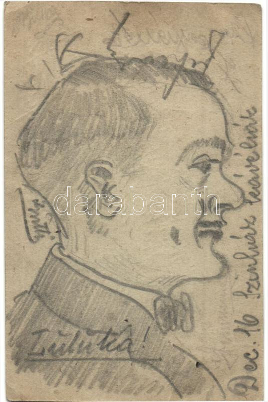 1917 I. világháborús tábori posta levelezőlap, kézzel készült rajz csokornyakkendős férfiról feliratokkal / WWI hand-drawn man in a bow tie with texts, military field post (fa)