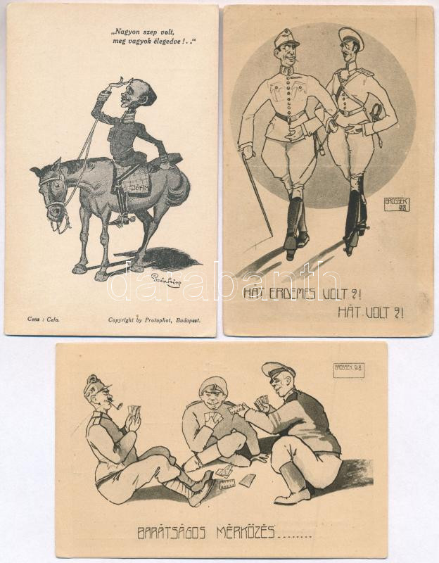 3 db RÉGI humoros katonai motívumlap; 2 db Brossek békekarikatúra Nr. 108 & 110, 1 db Szép Lajos karikatúra / 3 pre-1945 humorous postcards, caricatures; s: Brossek, Szép Lajos