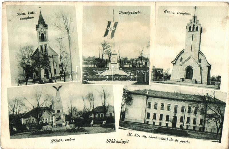 Leírás: Budapest XVII. Rákosliget, katolikus és evangélikus templom, országzászló, Hősök szobra, elemi népiskola, Pfeifer József kiadása (b)
