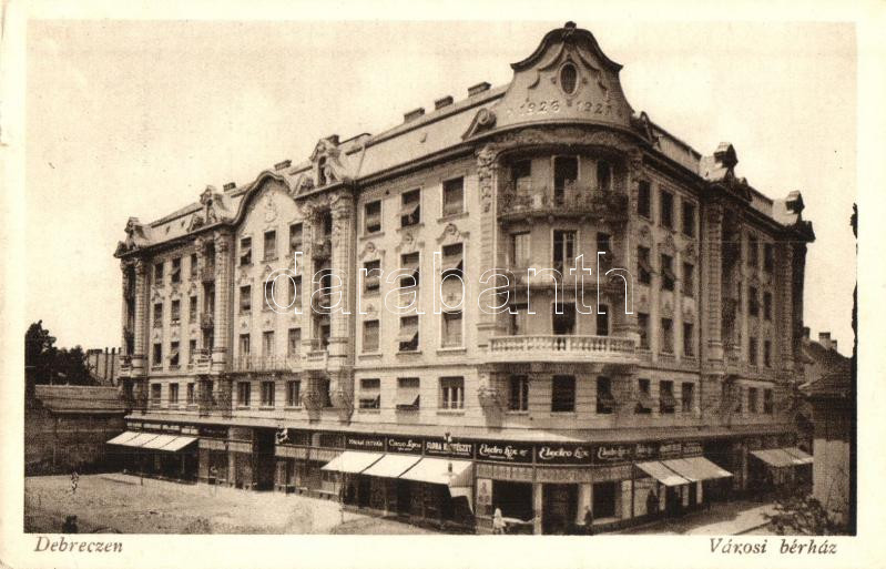 Leírás: Debrecen, Városi bérház, Electro Lux üzlet, Flóra kertészet és Tokaji István üzlete (EK)