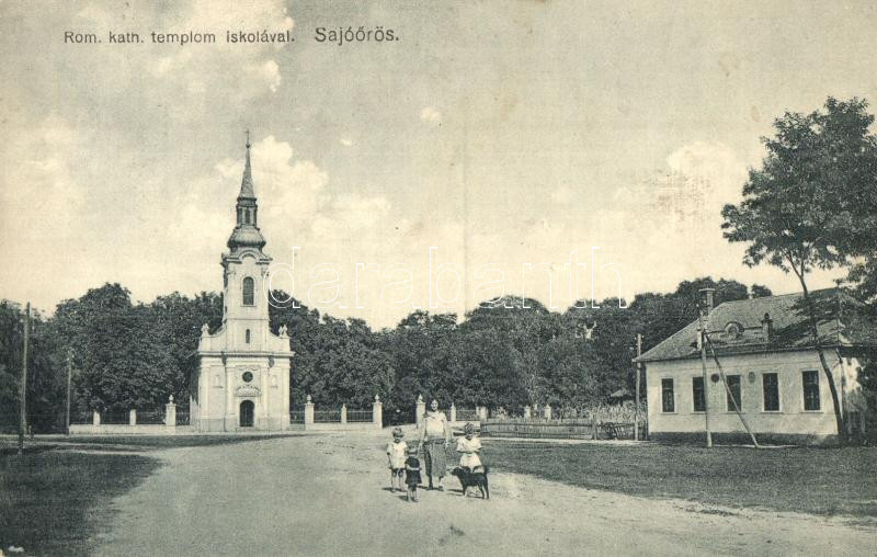 Leírás: Sajóörös; Római katolikus templom, iskola, kiadja a Hangya szövetkezet
