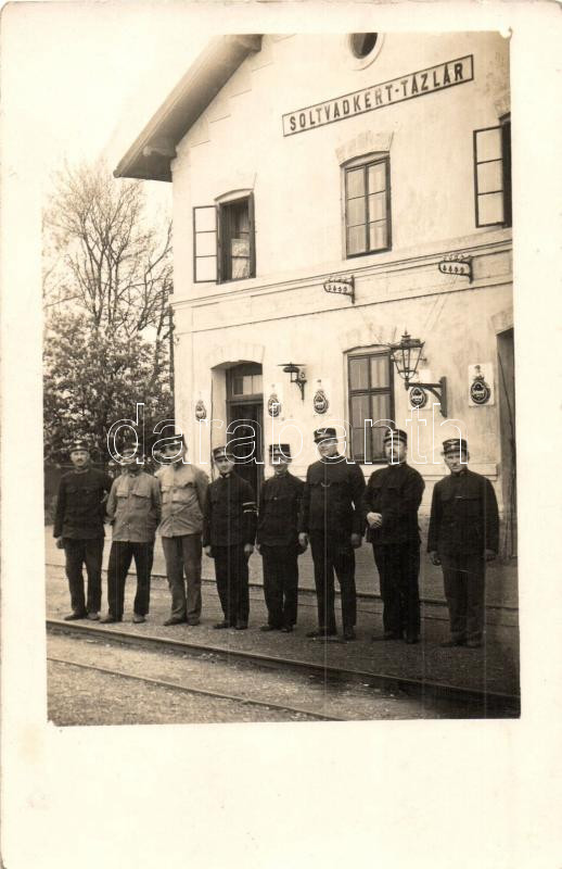 Soltvadkert-Tázlár vasútállomás, vasutasok csoportképe, photo (EB) https://www.darabanth.com/hu/282-Gyorsarveres/282.0/Kepeslapok/Magyarorszag~200007/Soltvadkert-Tazlar-vasutallomas-vasutasok-csoportkepe-photo-EB~II1458093