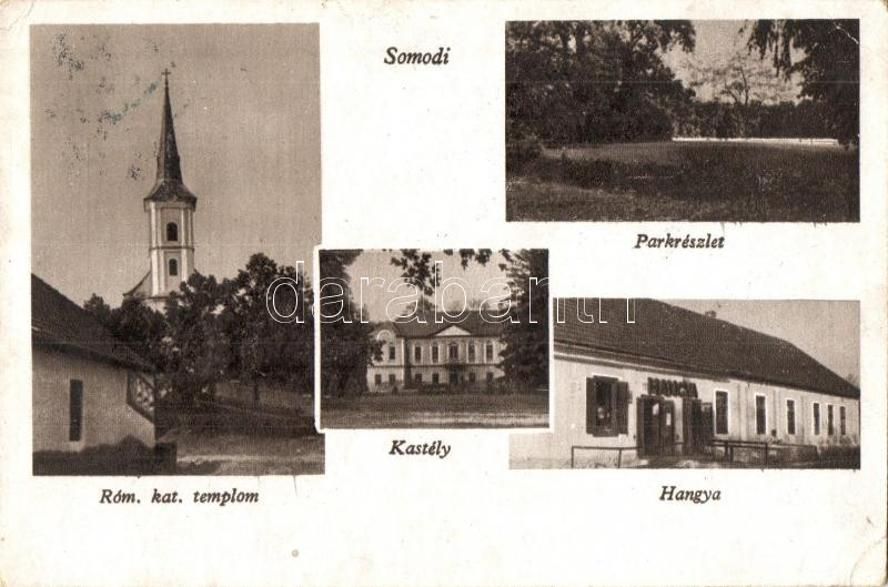 Leírás: Somodi; Római katolikus templom, kastély, park, Hangya Szövetkezet épülete és kiadása (EK)