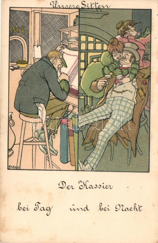 'Der Kassier bei Tag und bei Nacht' Faragó Géza, Erkölcseink (Unsere Sitten) képeslap sorozat grafikai tervnyomata / postcard art design by Géza Faragó (non Pc) (fl)