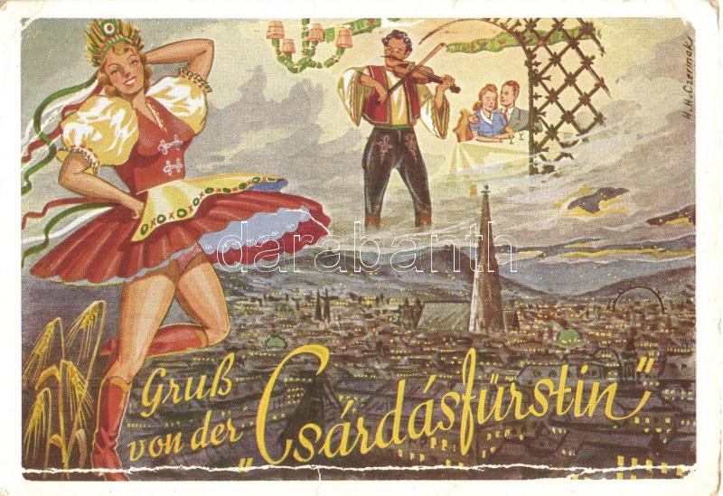 Gruss von der Csárdásfürstin! / Bécsi magyar vendéglő reklámlapja / Csárdásfürstin, Karl Koci Ungarische Unterhaltungs-Gaststatte, Wien / Hungarian restaurant in Vienna, advertisement s: H. H. Czermak (fa)
