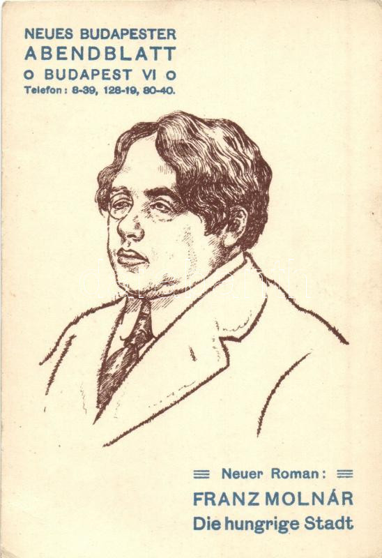 Neues Budapester Abendblatt folyóirat reklámlapja, Molnár Ferenc új regénye 'Az éhes város' / German-language daily newspaper from Budapest advertises Ferenc Molnar's new novel (EK)