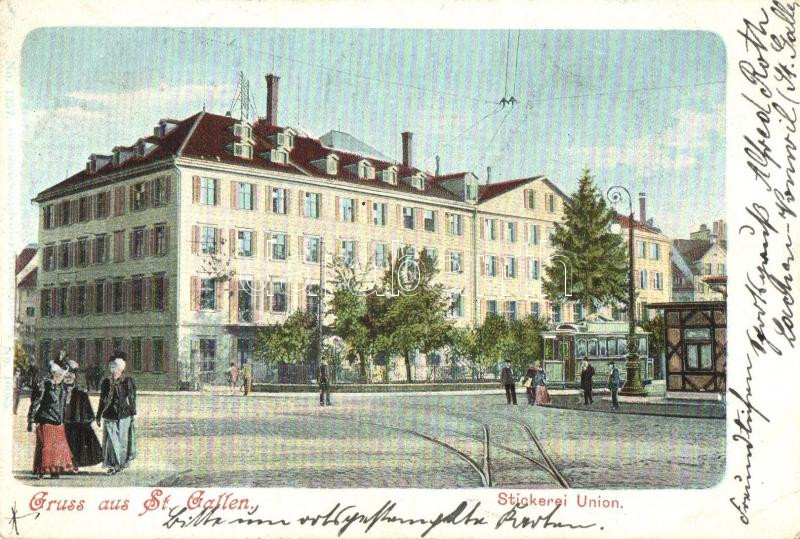Leírás: St. Gallen, Stickerei Union / embroidery union, tram (EK)