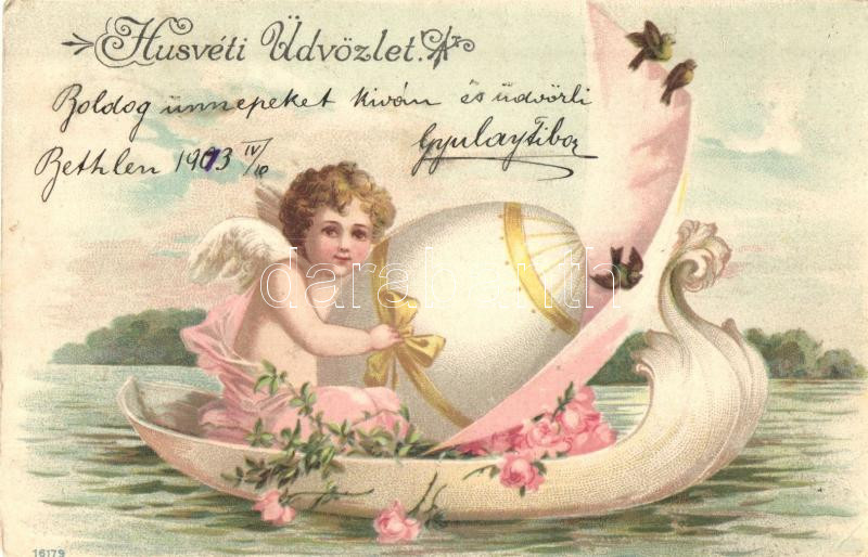 Leírás: Húsvéti üdvözlet / Easter greeting card, angel in feather boat, litho (EK)