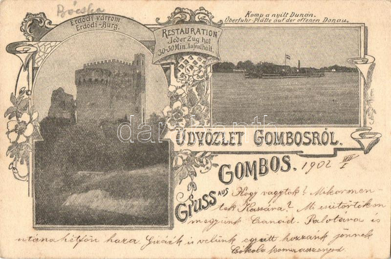 Leírás: Gombos, Bogojevo; Erdődi Várrom, Komp a nyílt Dunán, étterem reklám / castle ruins, ferry, restaurant advertisement, Art Nouveau (EK)