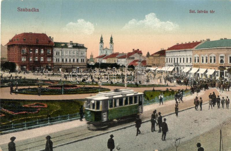 Szabadka, Subotica; Szent István tér, villamos / square, tram (fa) https://www.darabanth.com/hu/282-Gyorsarveres/282.0/Kepeslapok/Vajdasag~200012/Szabadka-Subotica-Szent-Istvan-ter-villamos-square-tram-fa~II1454601