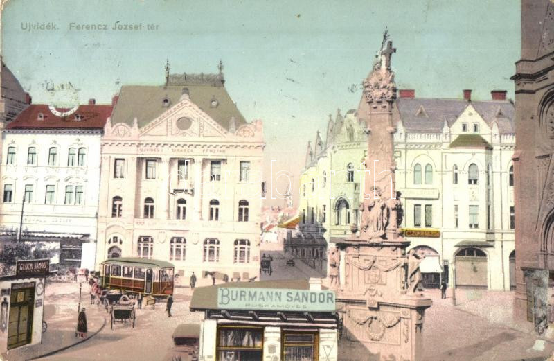 Újvidék, Novi Sad; Ferenc József tér, Glück János, Kovács József, Burmann Sándor puskaműves üzletei, cukrászda, takarékpénztár, villamos / square, shops, confectionery, savings bank, tram (Rb)