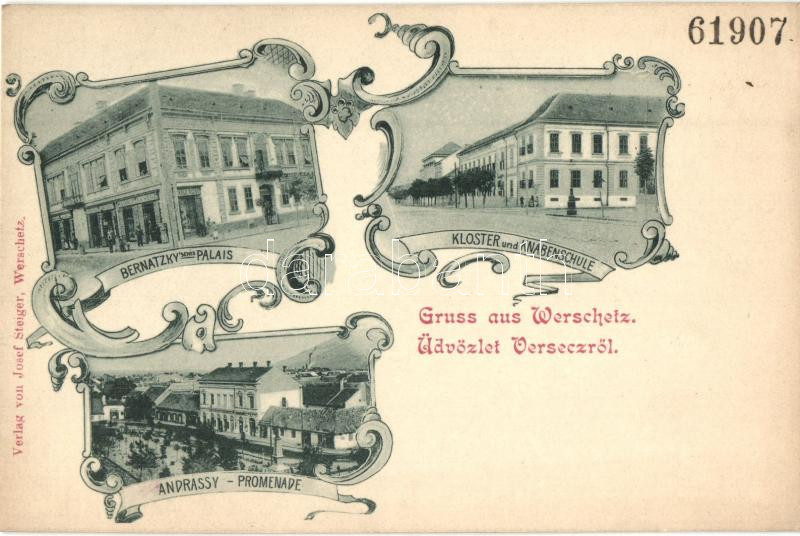 Leírás: Versec, Vrsac; Kolostor, fiúiskola, Bernatky palota, Andrássy sétatér, Lendle Rezső üzlete / closter, boys school, palace, promenade, shop, Art Nouveau (EK)