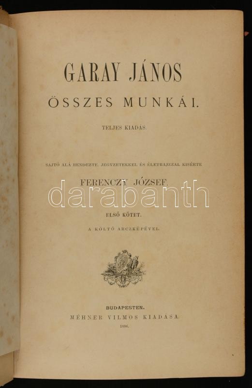 Garay János összes munkái I. Sajtó alá rendezte, jegyzetekkel és életrajzzal kísérte: Ferenczy József. Bp., 1886, Méhner Vilmos. Első teljes kiadás. Kiadói gazdagon aranyozott, festett egészvászon kötés, aranyozott lapélekkel, Garay János arcképével, kissé kopottas borítóval, gerinccel, de egyébként jó állapotban. Csak első kötet.