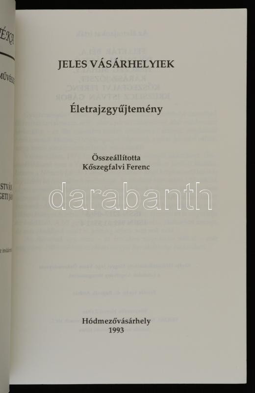 Jeles vásárhelyiek. Életrajzgyűjtemény. Összeáll.: Kőszegfalvi Ferenc.... https://www.darabanth.com/hu/282-Gyorsarveres/282.0/Konyvek/Konyvek-Egyeb-ritkasagok~40/Jeles-vasarhelyiek-Eletrajzgyujtemeny-Osszeall-Koszegfalvi-Ferenc-Hodmezovasarhely-~II1457469
