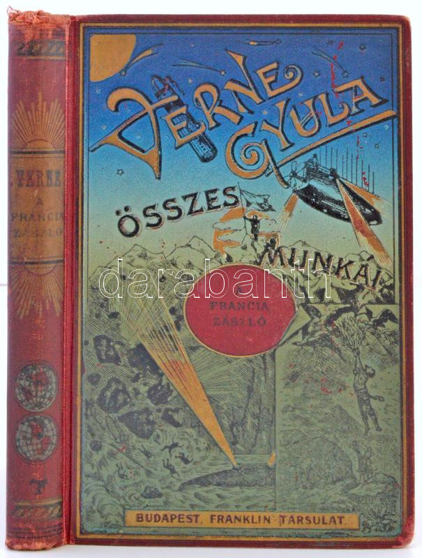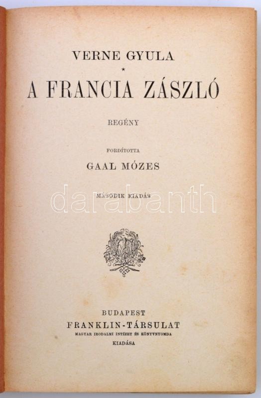 Verne Gyula: A francia zászló. Fordította Gaal Mózes. Budapest, é.n, Franklin-Társulat Magyar Irodalmi Intézet és Könyvnyomda. Kiadói aranyozott illusztrált egészvászon kötés, kissé kopottas gerinccel, borítóval, egészoldalas illusztrációkkal, az elülső előzéklapon bejegyzéssel.